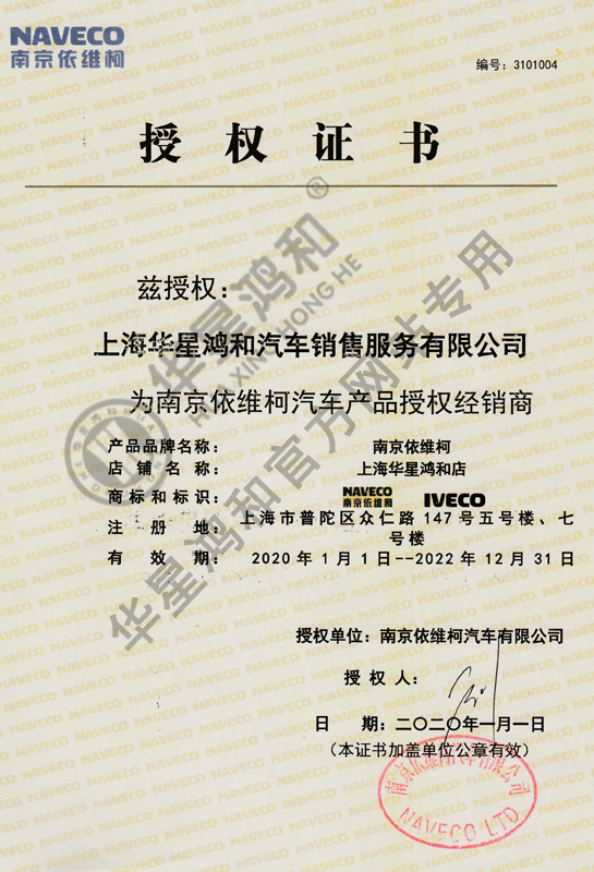 南京依維柯2020-2022經(jīng)銷商授權證書