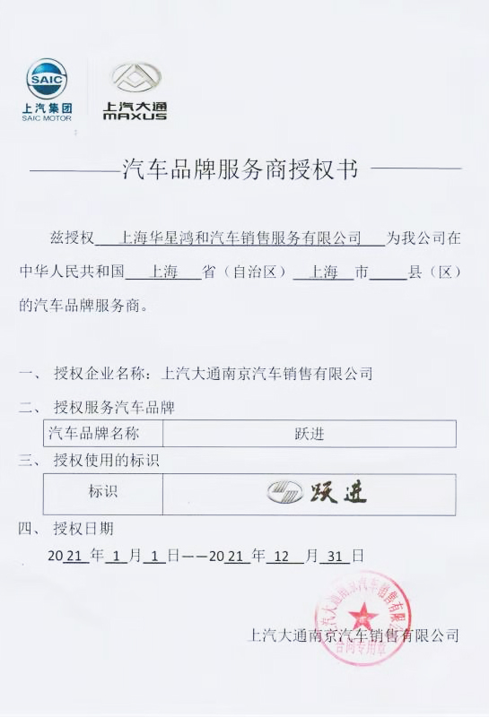 上汽躍進汽車品牌經(jīng)銷商授權書