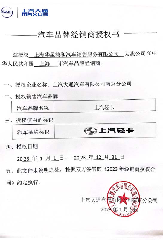 上汽輕卡汽車品牌經(jīng)銷商授權書